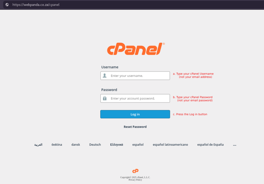 First things first, you need to get into your cPanel dashboard. This is usually at: https://yourdomain.co.za/cpanel. Enter your username and password (these are usually provided by your hosting provider).